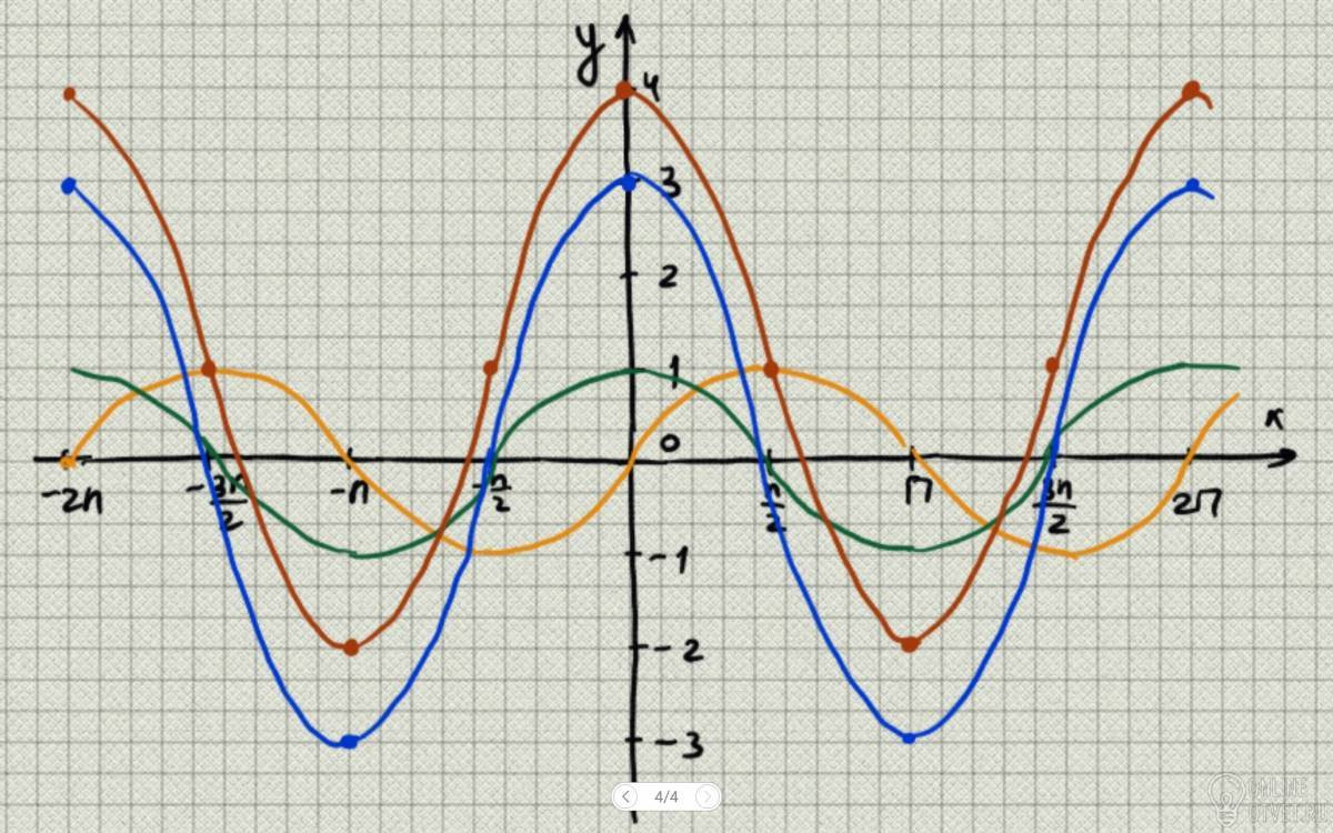 4. К синей функции прибавляют 1. С помощью параллельного переноса y = 3sin(pi/2 + x) поднимаем на 1 вверх (ось OY). В итоге получаем красную функцию y = 3 sin(x + pi/2) + 1