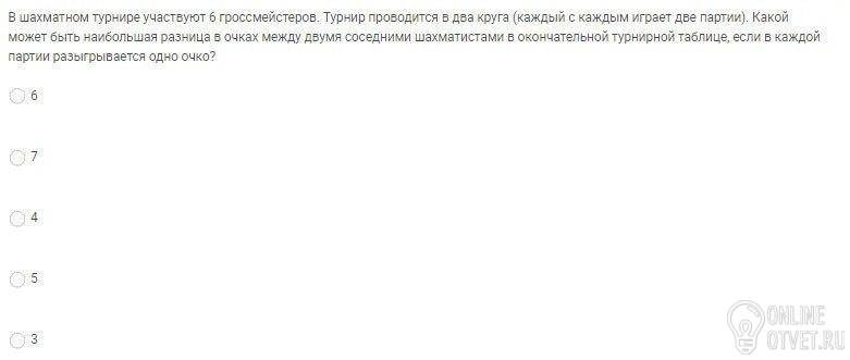2) Гроссмейстеров всего 6, турнир играется в два круга, значит первый игрок сыграет в первом круге 5 партий, второй игрок еще четыре, поскольку одну партию против первого игрока мы уже учли, третий игрок еще 3 партии и т. д., т. е. всего в первом круге будет сыграно 5 + 4 + 3 + 2 + 1 = 15 партий. Столько же партий будет сыграно и во втором круге. Поскольку по условию в каждой партии разыгрывается по очку, то суммарное количество очков за время всего турнира будет равно 30. Максимальная разница в очках между соседними игроками будет достигаться в двух случаях. 1) Когда занявший первое место игрок набрал максимальное количество очков, а остальные пятеро поделили оставшиеся очки между собой. Тогда, т. к. занявший первое место игрок сыграл 10 партий (по 5 в каждом круге), то он мог набрать максимум 10 очков. Оставшиеся пятеро игроков поделили между собой 30 - 10 = 20 очков, т. е. каждый из них получил по 20/5 = 4 очка. Разница в очках между игроками, занявшими первое и второе места составит 10 - 4 = 6 очков. 2) Когда занявший последнее место игрок не набрал ни одного очка, а оставшиеся 5 игроков опять-таки поделили оставшиеся 30 очков между собой. Тогда первая пятерка ироков получила по 30/5 = 6 очков, а занявший последнее место 0 очков. Снова разница между предпоследним и последним местами в таблице составляет 6 очков. Это и есть максимальная разница в очках.