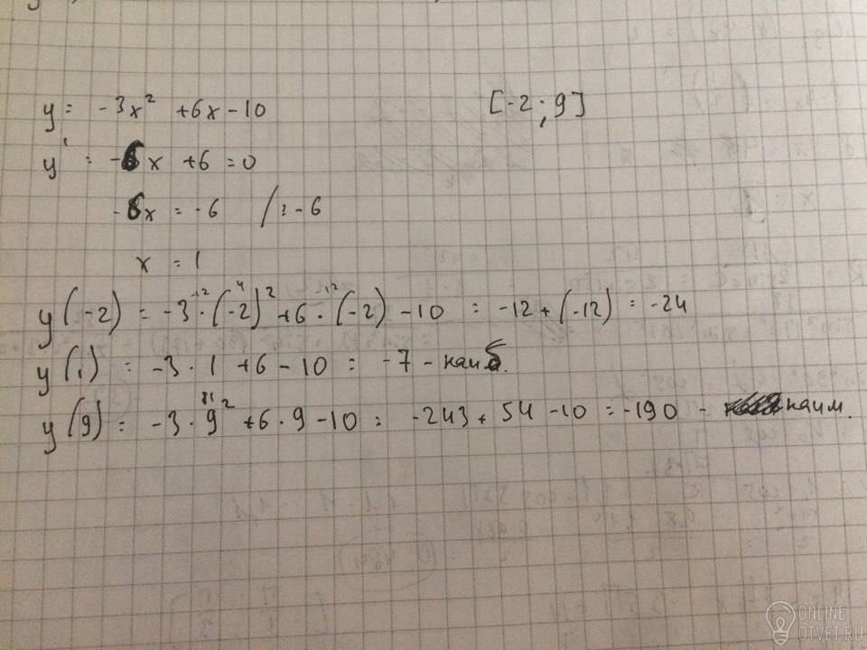 Найдите наибольшее и наименьшее значение функции y=-3x²+6x-10 на отрезке [-2;9]