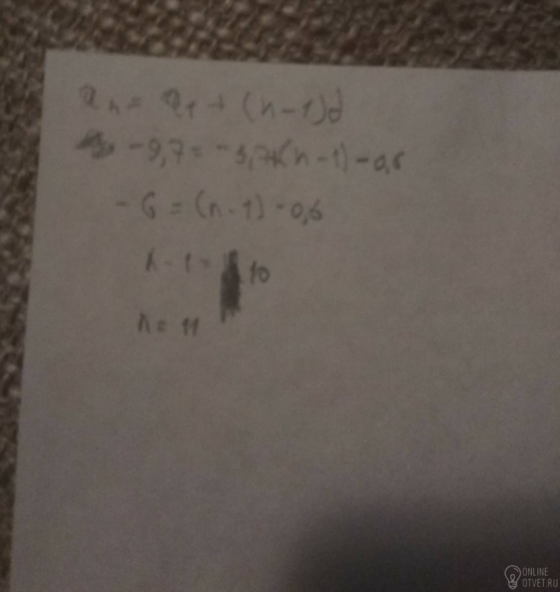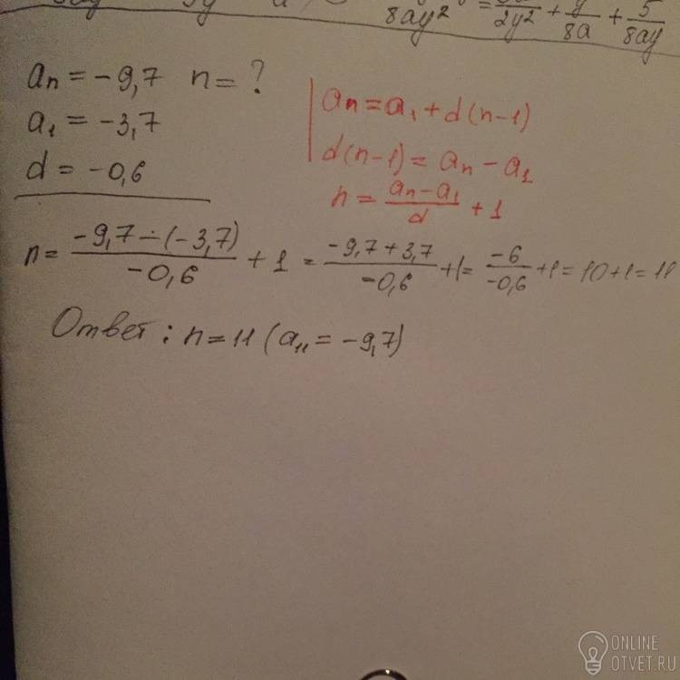 Найдите номер члена арифметической прогрессии равного -9,7,если a1=-3,7,а d=-0,6
