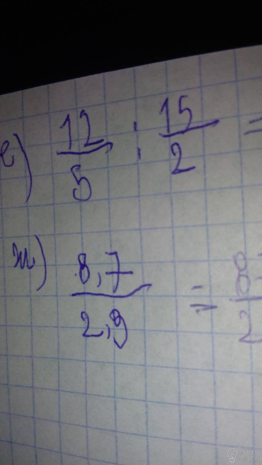 ж) 8,7 : 2,9 = 87/10 : 29/10 = 87/10 • 10/29 ( 10 и 10 сокращаются ) = 87/29= 3.