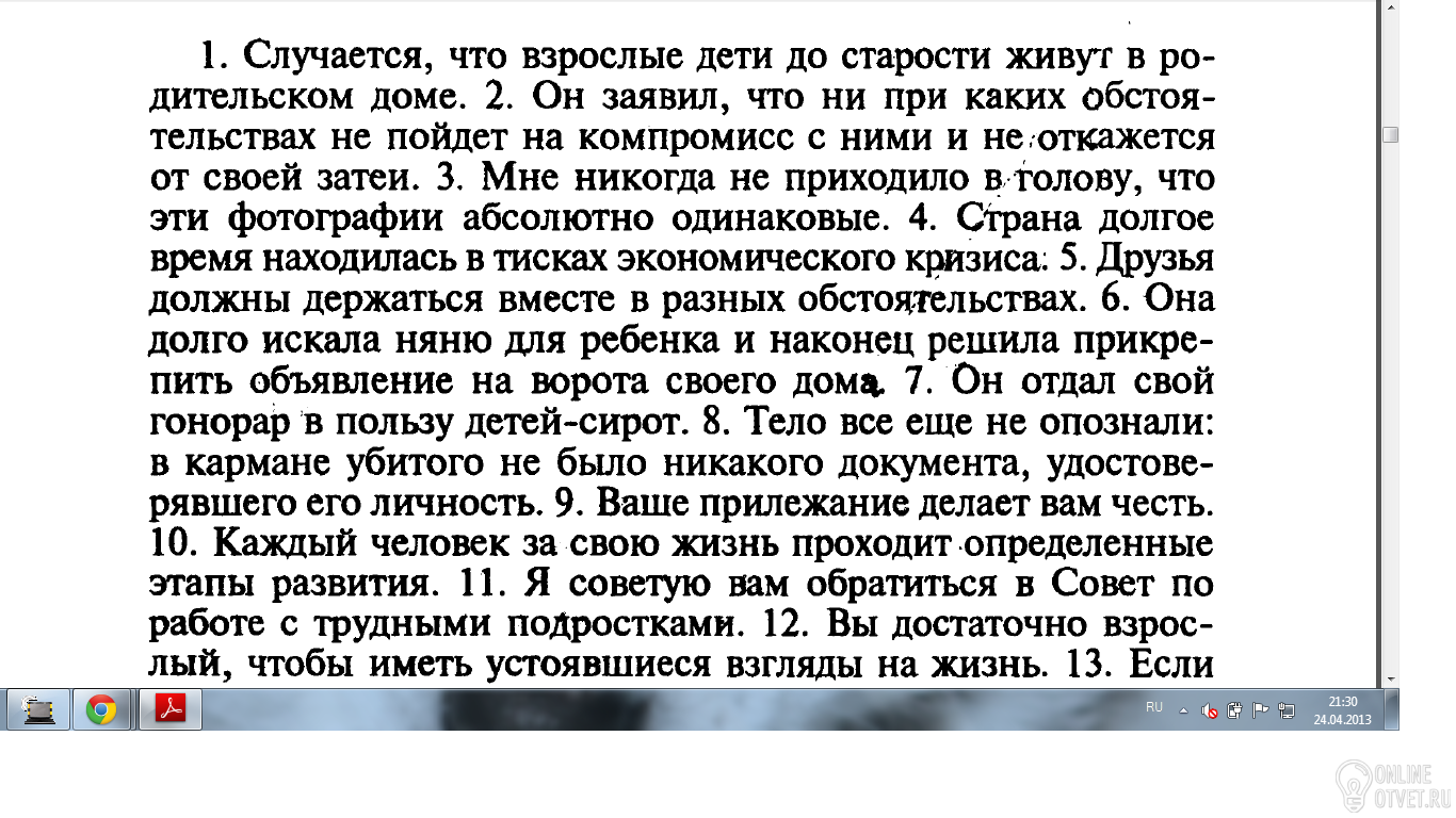 1. It happens that the older kids to grow old living in his parents' house. 2. He said that under no circumstances would not compromise with them and not abandon his idea. 3. It never occurred to her that these pictures are absolutely identical. 4. The country has long been in the grip of economic crisis. 5. Friends should stick together in different circumstances. 6. She has long sought a nanny for the child and finally decided to attach a declaration to the gate of his house. 7. He gave his fee for the benefit of orphans. 8. The body has not yet identified: in the pocket of the killed had no documents proving his identity.9 . Your diligence does you credit. 10 . Each person for the life passes certain stages of development. 11 . I advise to you to treat in Council for work difficult teenagers. 12 . You rather vzroskly to have the settled outlooks on life. 13 . If you want to be healthy and stop remaining in shape, first of all, bad habits. 14 . He so wanted to appear again at home; he looked forward when native again will embrace him 15. Since ancient times of person овека intrigue such phenomena, as earthquakes, floods, and others pokdobny of 16. After continuous quarrels they, at last, could feel safe with each other.