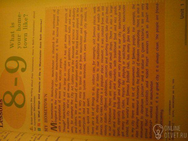 Мой родной город Манчестер. Манчестер расположен на северо-западе Англии в графстве Большой Манчестер. Он является вторым по величине городом с населением более 400,000 человек. Хотя Манчестер не такой большой, как Лондон он получил много хороших аспектов современного города. Мы получили многие театры, художественные галереи, концертные залы и музеи, например, городская художественная галерея и Музей науки и промышленности и другие. Мы гордимся нашим аэропортом, который является третьим по загруженности аэропортом в Великобритании. С ним очень легко поехать в Манчестер и из Манчестера и через сельскую местность. И наша система трамвая Метролинк которая проходит по улицам города, чистая быстрая и бесшумная.Тут можно многое, посетители могут, например, посетить известные места, ходить в парки, пройтись по магазинам или слушать нашу традиционную музыку и смотреть народные танцы. Наш G-Mex Центр является популярным местом. Однако он был создан из старого железнодорожного вокзала. Различные концерты и спортивные мероприятия проходят там. В нашем Чинтауне есть много кафе и небольшие магазины. Существует также большой торговый центр и несколько крупных магазинов и рынков с традиционной едой и хорошими товарами. Спорт, особенно футбол и регби очень популярны в нашем городе. Манчестер имеет много спортивных клубов. Такие люди, как игры или просмотра спортивных здесь. "Манчестер Юнайтед" самый известный мировой футбольный клуб имеет много поклонников здесь. В моем городе есть много памятников известным людям. Например, меморил Алану Тьюрингу. Существует также памятником Аврааму Линкольну и статуя королевы Виктории. Мы очень гордимся тем, что великие ученые и лауреаты Нобелевской премии, такие как Джоуль и Резерфорд работали в Манчестере. Мне нравится мой родной город. Это большой город. Тут всегда чисто. А люди доброжелательные и радушные.