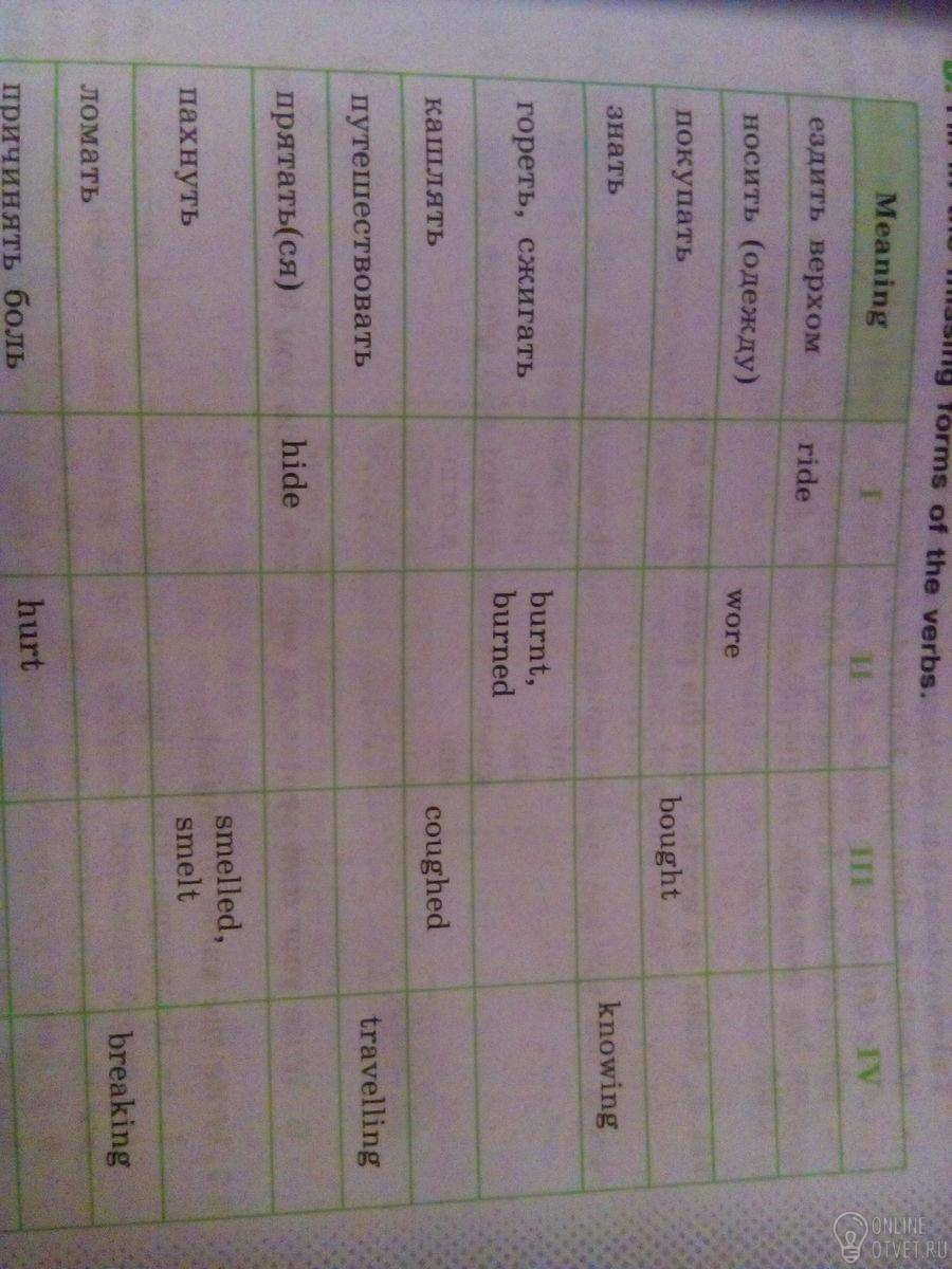 Ездить верхом -ride-rode-ridden.Носить одежду-wear-wore-worn.Покупать-buy-bougth- bougth.Знать-know-knew-knovn.Сжигать-burn-burnt-burnt.Кашлять-не знаю.Путешевствовать-cough-cough-couging.Прятать-ride-rode-ridden.Пахнуть-slmell-smelled-smelled.Ломать-break-broke-broken.Причинять боль-beat-beat-beaten.Kивать-nod-nod-nodded.завязывать-tie-tie-tiedБеспокоится-worry-worreg-worreg.Жарить-steam-steamet-steamed.Бросать-cast-cast-cast.В последнем столбике просто приписать окончание ing.
