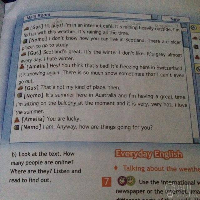 - привет ребята. Я в интернет кафе. На улице идет очень сильный дождь. Мне надоела такая погода. Дождь идет все время.