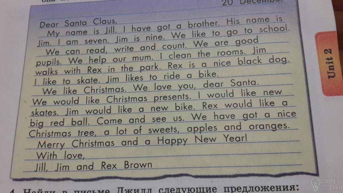 Нам нравится Рождество. Мы любим тебя, дорогой Санта. Мы хотели бы рождественские подарки. Я хотела бы новые коньки. Джим хотел бы новый велосипед. Рекс хотел бы большой красный мяч. Приходи и посмотри на нас. У нас есть красивое рождественское дерево, много сладостей, яблок и апельсинов.