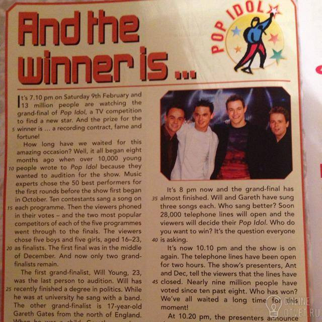 В пятницу 7.10 вечера 9 февраля 13 миллионов человек смотрят грандиозный финал (шоу) Поп-идал, телевизионное соревнование ищет новую звезду. И приз для победителя звукозаписывающий контракт, слава и счастье.