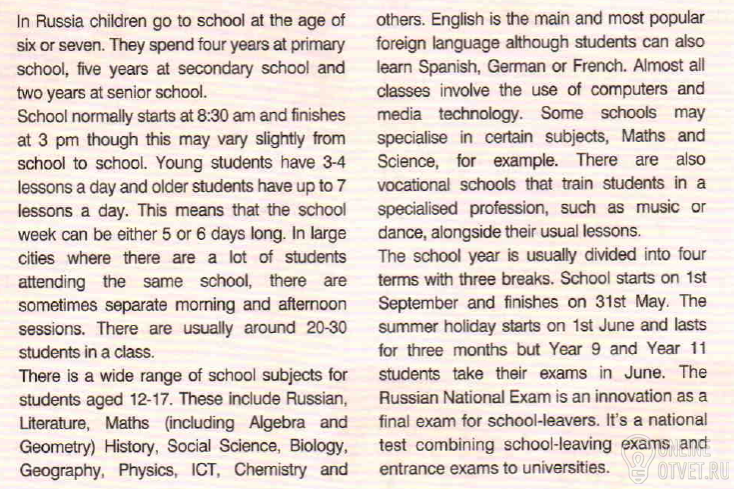 В России дети идут в школу в возрасте 6 или 7 лет. Они учатся три года в начальной школе, потом 5 лет в средней и 2 в старшей школе.