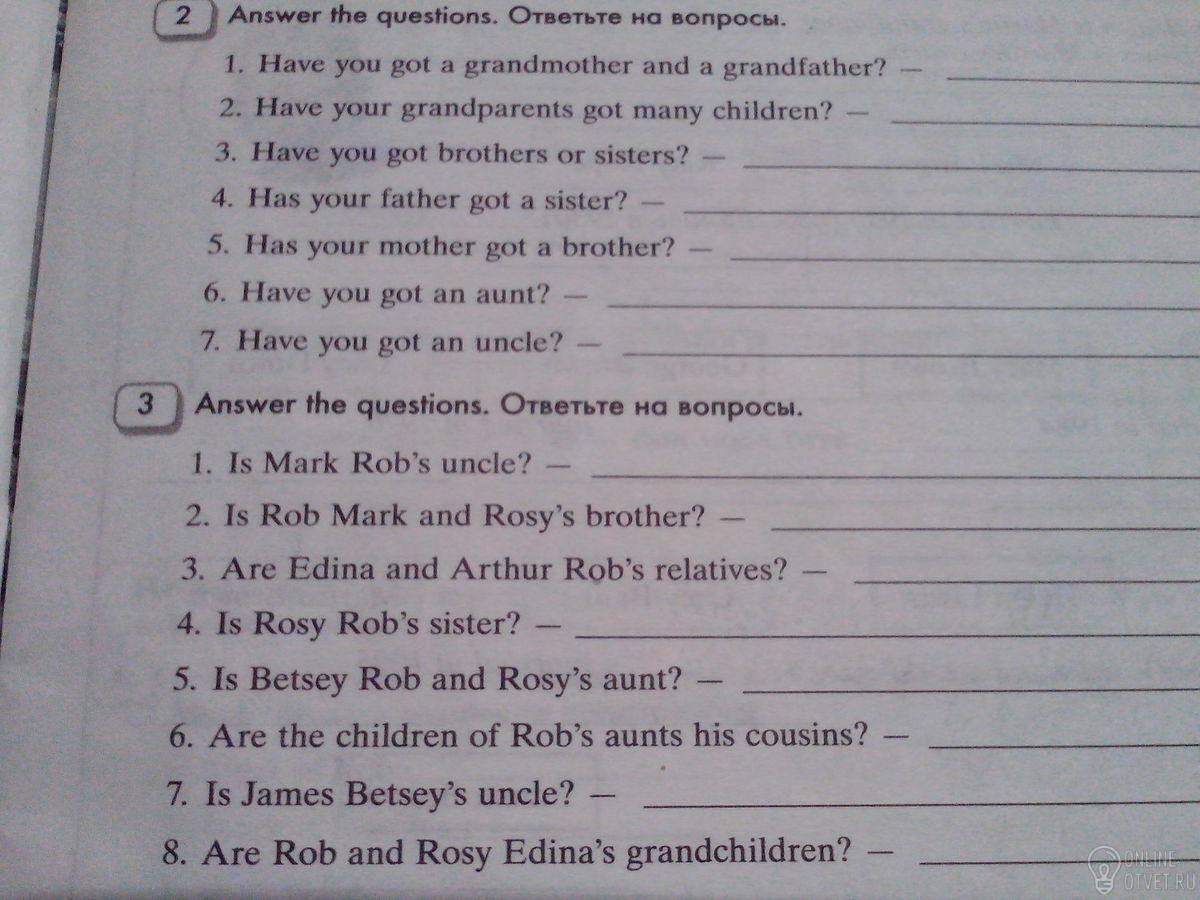 2.1.yes, i have a grandma and a grandpa. 2. No, my parents haven't a lot of children. I'm the only child in our family. 3. No, i haven't. 4. Yes, my father has got a sister 5.yes, my mother has got a brother 6. Yes, i've got an aunt 7. Yes, i've got an uncle 3.1.yes, Mark is Rob's uncle 2. No, Rob is not Mark and Rosy's brother 3, Yes, Edina and Arthur aren't Rob's relatives 4. Yes, Rosy is Rob's sister 5. Betsey isn't Rob and Rosy's aunt 6. Yes, children of Rob's aunts are his cousins 7. James is Betsey's uncle 8. Yes, Rob and Rosy are Edina's grandchildren