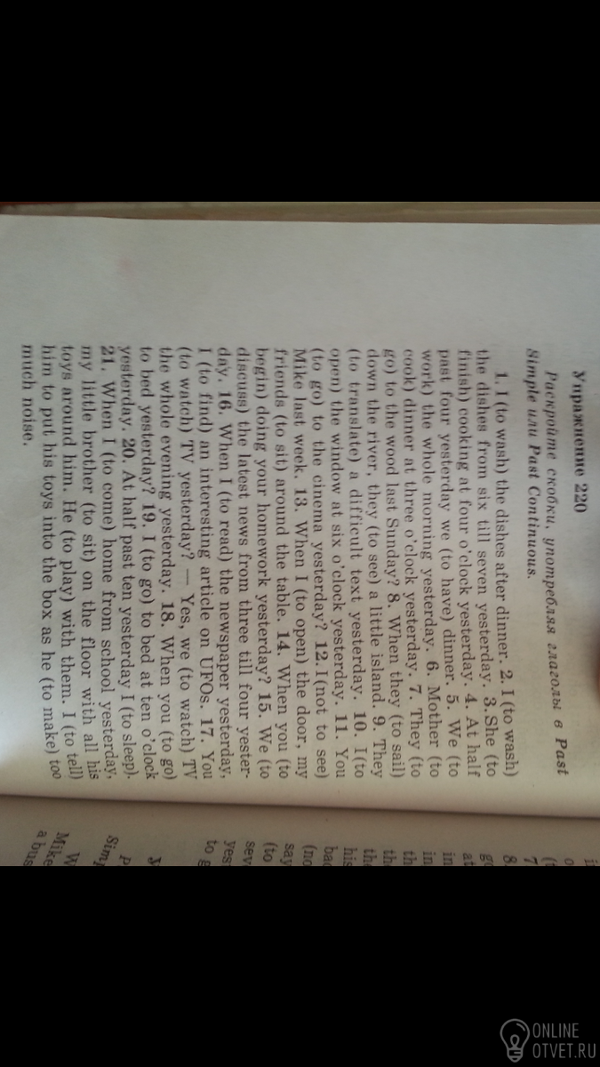 1. I washed. 2. I was washing. 3. She finished. 4. We were having. 5. We were working. 6. Mother was cooking. 7. Did they go. 8. They were sailing, they saw. 9. They translated. 10. I opened. 11. Did you go. 12. I did not see. 13. I opened, my friends were sitting. 14. When did you begin. 15. We were discussing. 16. I was reading, I found. 17. Did you watch, we were watching. 18. When did you go. 19. I went. 20. I was sleeping. 21. I came, my little brother was sitting, he was playing, I told, he was making.
