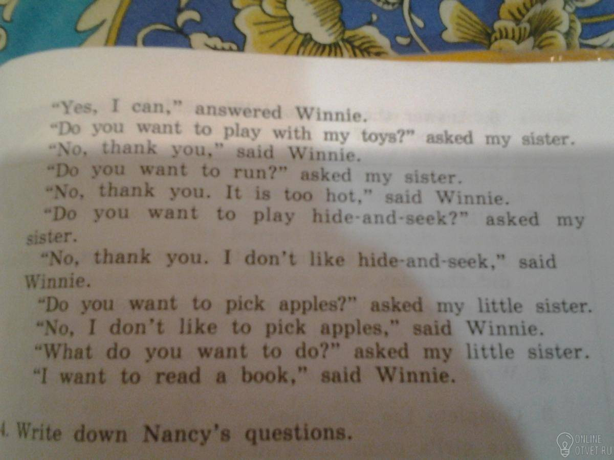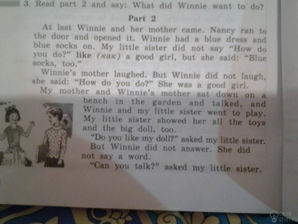 Наконецто Винни и её мама пришли.Нанси побежала к двери и открыла её.на Винни было голубое платье и голубые носки.Моя маленькая сестра не сказала.как дела ? как хорошая девочка она сказала голубые носки тоже. Мама Винни засмеялась.Но Винни не смеялась она сказала как дела? Она была хорошей девочкой Моя мама и мама Винни сели на скамейку и разговариаали ,а Винни и моя маленькая сестра пошли играть . моя малень края сестра показала свои игрушки и большую куклу тоже. Тебе нравится моя кукла спросила моя маленькая сестра .Но Винни не ответила. она не нашла слов.Ты можешь говорить спросила моя маленькая сестра Да я могу ответила Винни Ты хочешь играть с моими игркшками ?спросила моя сестра Нет спас ибо ответила Винни Ты хочешь бегать? Спросила моя сестра Нет спасибо слишком жарко сказала Винни Хочешь ли ты играть в прятки? спросила моя сестра Нет спасибо я не люблю прятки ответила Винни Pick apple незнаю возможно хочешь ли ты выбирать яблоки ?спросила моя сестра нет спасибо я не люблю яблоки сказала Винни Что ты хочешь делать спросила моя маленькая сестра Я хочу читать книгу сказала Винни.
