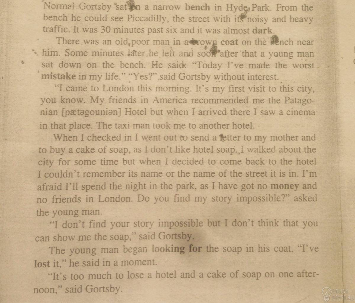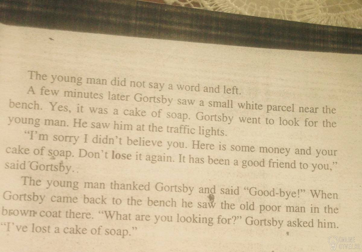 Когда я зарегистрировался в отеле, я вышел, чтобы послать письмо моей матери и купить (торт,кусок) из мыла, как мне не нравится мыло из отеля. Я немного прогулялся по городу, но когда я решила вернуться в отель я не мог вспомнить его имя или название улицы, на которой он находится. И я боюсь, что я буду ночевать в парке, так как у меня нет денег и нет друзей в Лондоне. Вы находите мой рассказ невозможно?" - спросил юноша.