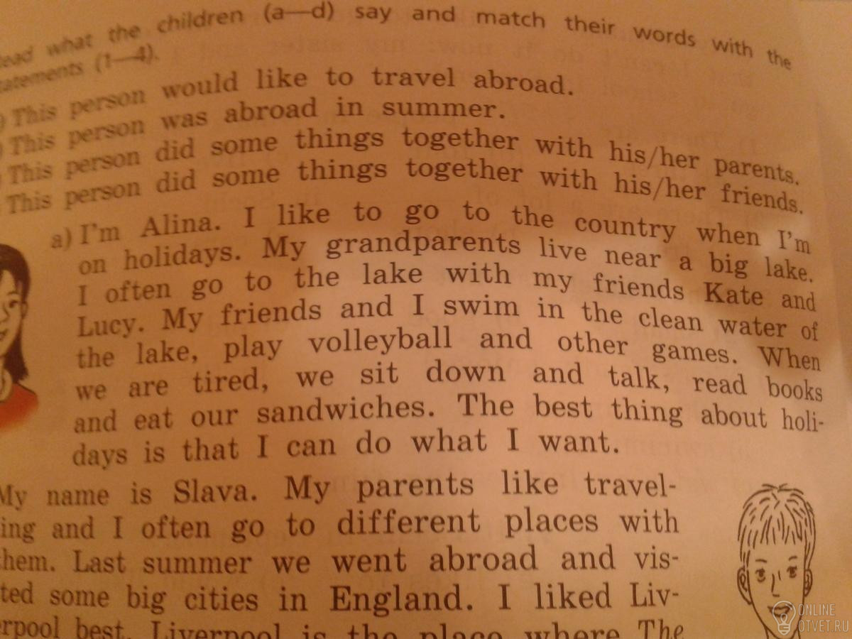 Я Алина. Мне нравится ездить в деревню во время каникул. Мои бабушка и дедушка живут прямо у большого озера. Я часто хожу к озеру со своими подругами — Катей и Люси. Я купаюсь с ними в чистой воде озера, играю в волейбол и другие игры. Когда мы устаем, мы садимся поболтать, читаем книги и перекусываем бутербродами. Самое классное в каникулах — это то, что я могу делать что хочу.