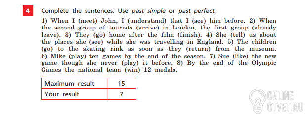 1) met, understood, had seen, 2) arrived, had already left, 3) they went, had finished, 4) told, had seen, 5) went, had returned, 6) had played, 7) liked, had never played. 8) had won. Надеюсь, что так, удачи)