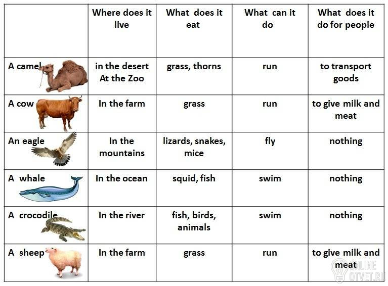Заполни таблицу animal,bird(a monki); where does it live?(in the zoo,in afrika); what does it eat?( bananas,fruit); what can it do(run,jump,climb the trees); what does it do for people?(help people).