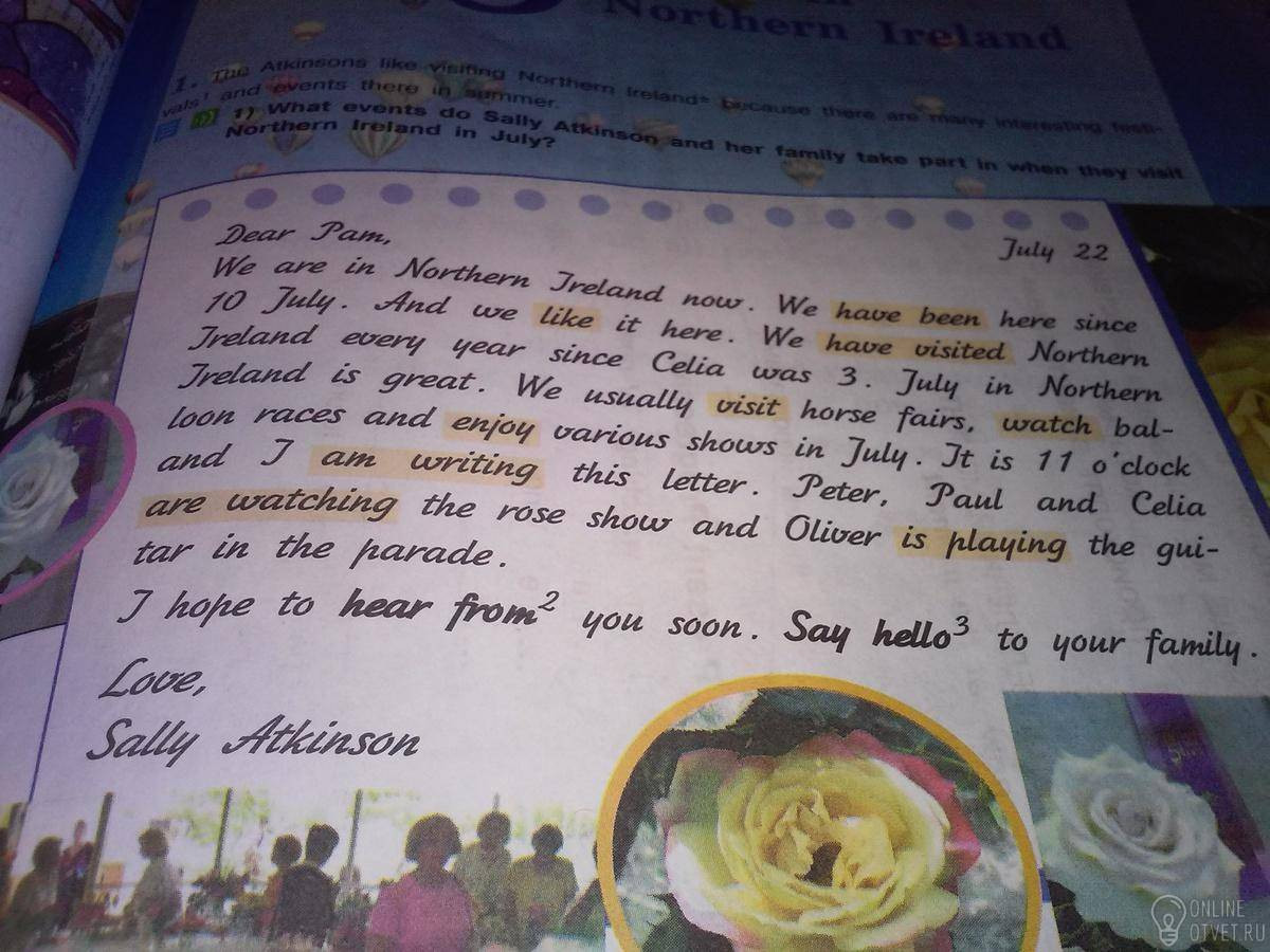 Мы сейчас в Северной Ирландии. Мы здесь с 10 июля.И нам нравится здесь.Мы посещаем Северную Ирландию с того ,как Селии исполнилось 3.Июль в Северной Ирландии хорош.Мы обычно посещаем лошадиные ярмарки,смотрим гонки шаров, и наслаждаемся различными шоу в Июле.Сейчас 11 часов и я пишу это письмо.Питер, Пол и Селия смотрят шоу роз и Оливер играет на гитаре в парадной.