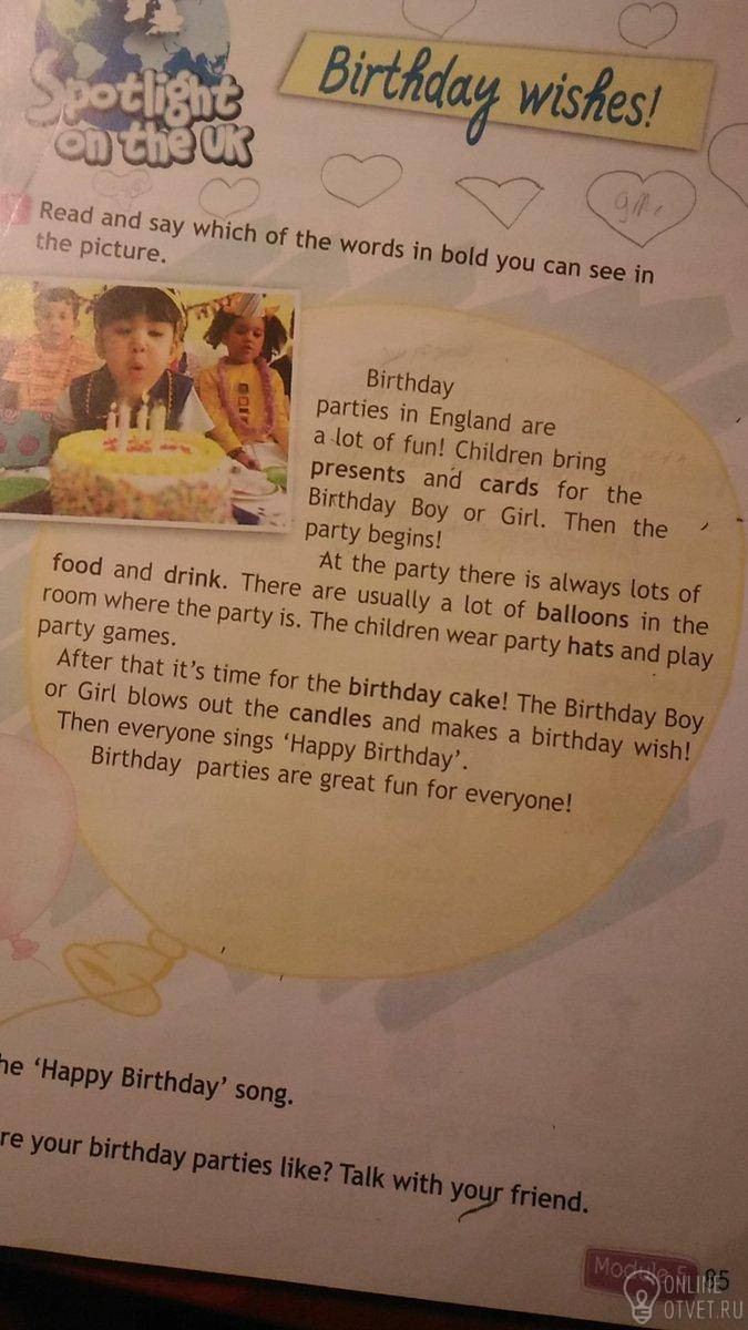 Дни рождения в Англии бывает много веселья.Дети дают подарки и открытки для мальчика или девочки.Потом начинается праздник. На празднике всегда много пищи и напитков.Как правильно много шаров в комнате где праздник.Дети одевают праздничные шапки и играют праздничные игры.После этого время праздничного торта.Именинник мальчик или девочка задувают свечи и говорят желания.Везде поют "С днём рождения" . День Рождения большое счастье для каждого.