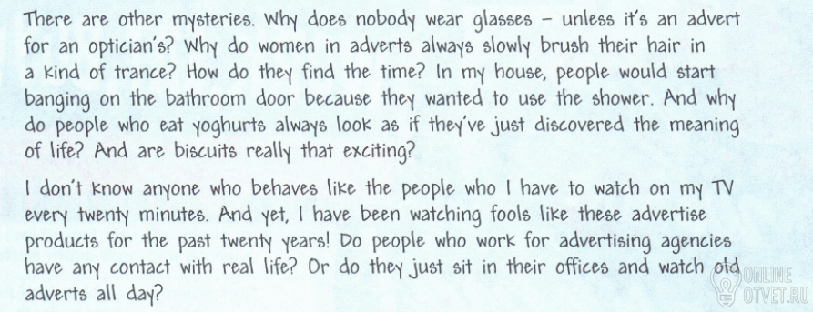 Есть другие тайны. Почему никто не носит очки, если это не является рекламой для оптики? Почему женщины в рекламе всегда медленно моют свои волосы в своем роде находясь в трансе?Как они находят время?В моем доме люди начнут стучать в дверь ванной, потому что они хотят воспользоваться душем.И почему люди, которые едят йогурты всегда выглядят так, будто они только что обнаружили смысл жизни? И это печенье действительно так интересно?Не знаю никого, кто ведет себя так, как выглядят люди, которые появляются в моем телевизоре через каждые двадцать минут. И все же, я наблюдал, как эти дураки рекламируют продукты уже 20 лет! Есть люди, которые работают для рекламных агенств, и не имеют никаких контактов с реальной жизнью? Или они просто сидят в своих офисах и смотрят старые объявления целый день?