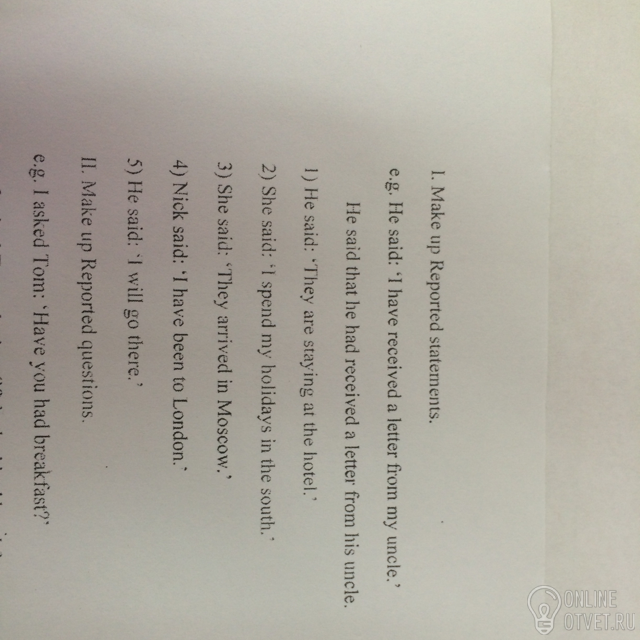 Составляют заявления Зафиксирован. например Он сказал: получил письмо от моего дяди. Он сказал, что он получил письмо от своего дяди. л) Он сказал: "Они остановились в гостинице 2) Она сказала:. провести Ny отпуск на юге 3) Она сказала:". Они прибыли в Москву. 4) Ник сказал: "Я был в Лондоне 5) Он сказал:.. Я пойду туда" . Л.Л. Составляют Зафиксирован вопросы, например, спросил Том: "Были ли у вас завтрак?