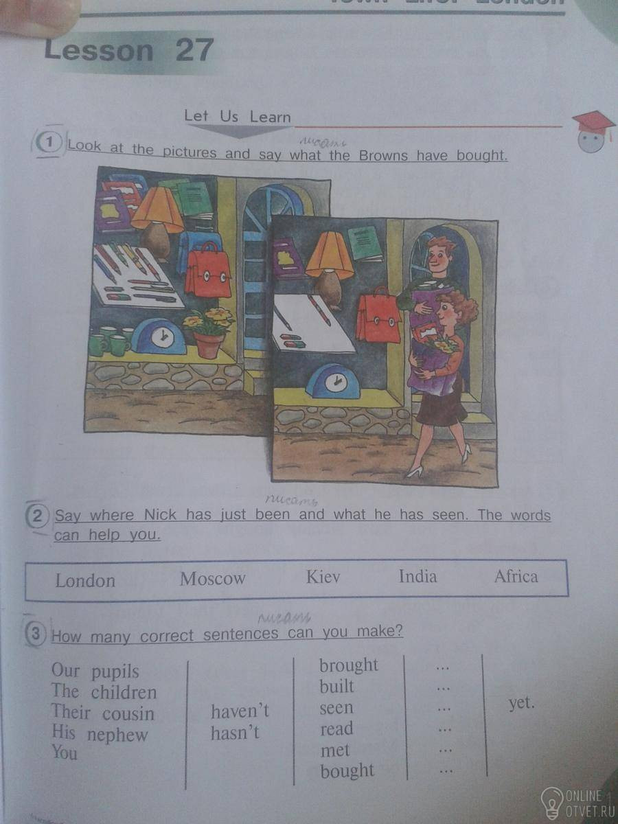 2.Nick was in London and saw a Big Ben and a Bridge. He was in Moscow and saw a Red Square. In Kiev he saw Kreschatik.In India he saw big elephants. In Africa he saw Victorias Waterfall.