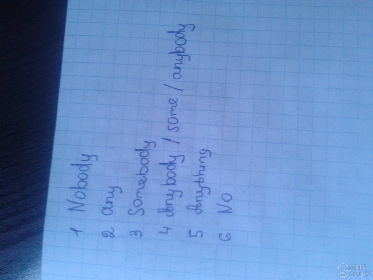 1.He couldn’t get help, there was ... around. 2. Do you have ... money on you? 3. Open the door, please. ... is knocking. 4. Did you see ... on the parking yesterday at 9 p. m? Yes, I saw ... people, but I didn’t recognise ... . 5. It was so dark, that I could see ... . 6. Sorry, but we have ... vacancies for you at the moment.