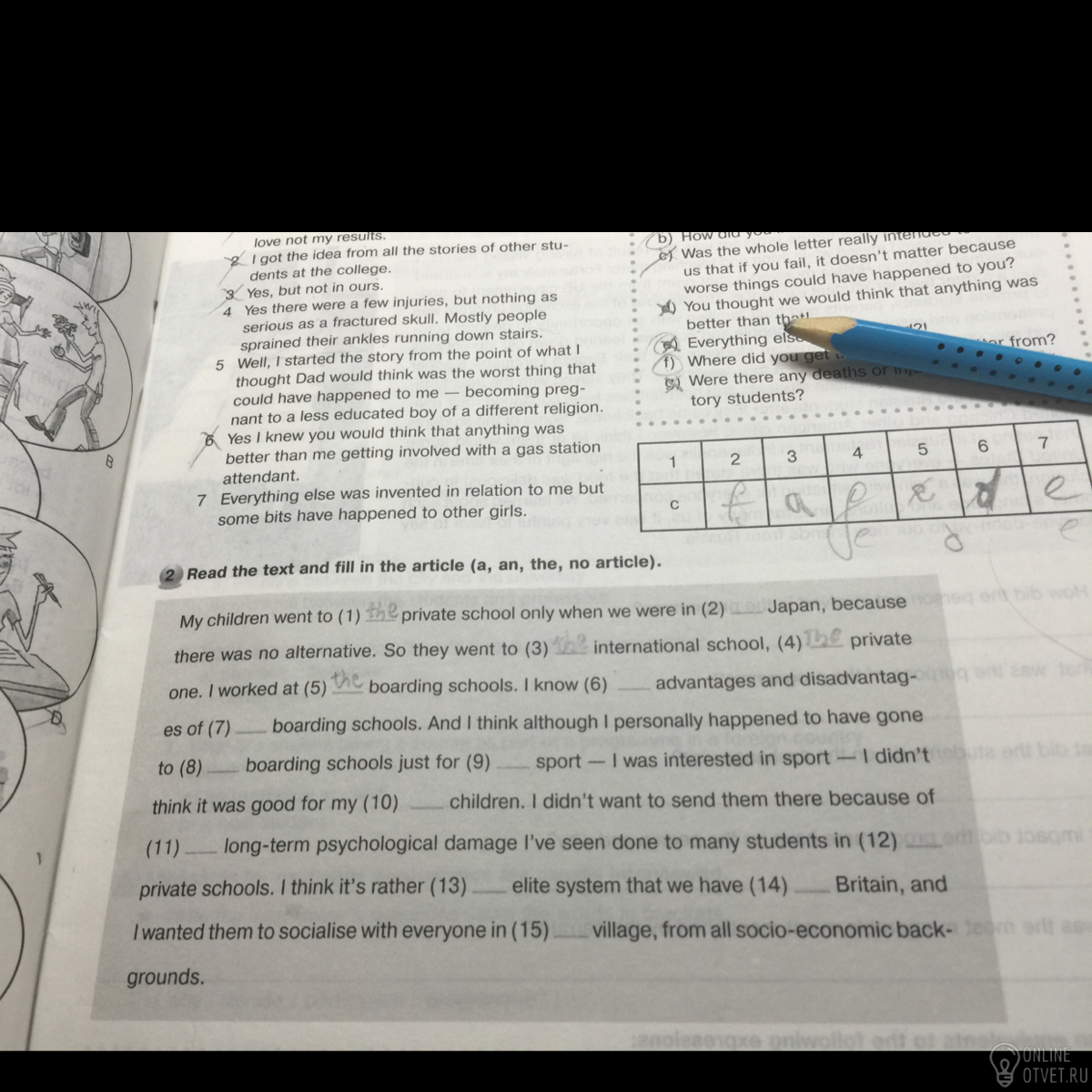 14 - здесь из возможный вариантов ответа не походит ничего, но по смыслу нужно поставить предлог in в, а его в учебнике нет. Можешь либо его поставить, либо ничего не поставить.
