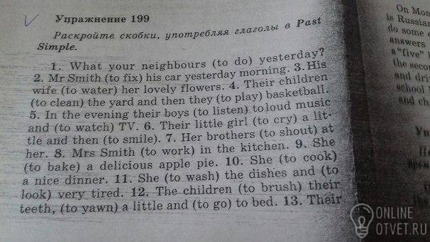 1. What did your neighbours do) yesterday? 2. Mr Smith fixed) his car yesterday morning. 3. His wife watered) her lovely flowers. 4. Their children cleaned) the yard and then they played basketball. 5. In the evening their boys listened toloud music and watched TV. 6. Their little girl cried a little and then smiled. 7. Her brothers shouted at her. 8. Mrs Smith worked in the kitchen. 9. She baked a delicious apple pie. 10. She cooked a nice dinner. 11. She washed the dishes and looked very tired. 12. The children brushed their teeth, yawned a little and went to bed. 13. Their mother changed her clothes and brushed her hair. Then she talked on the phone. 14. Her husband smoked a cigarette and talkeds to his wife. 15. They waited for the bus. The bus arrived at 9 o'clock. 16. They visited their friends. 17. They danced a lot there. 18. Mr and Mrs Smith rested very well last night. They really had awonderful time with their friends. 19. Mr Smith fixed his car yesterday morning? Mrs Smith watered her lovely flowers? Their children cleaned the yard? They played basketball? When their boys watched TV? Who baked a delicious lemon pie? Did Mrs Smith cook a good dinner? Did the children go to bed? Why do Mr Smith and Mrs Smith have a wonderful time last night? Where were they?