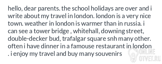 Привет,дорогие родители.школьные выходные закончились и я пишу о моей поездке в лондон.лондон это очень приятный город.погода в лондоне теплее,чем в россии.я смогу увидеть таурский мост,WHITEHALL,DOWNING STREET,DOUBLE-DECKER BUD,трафальгарскую площадь и многое другое.часто я обедаю в знаменитом ресторане в лондоне,мне нравится моя поездка и я куплю много сувениров