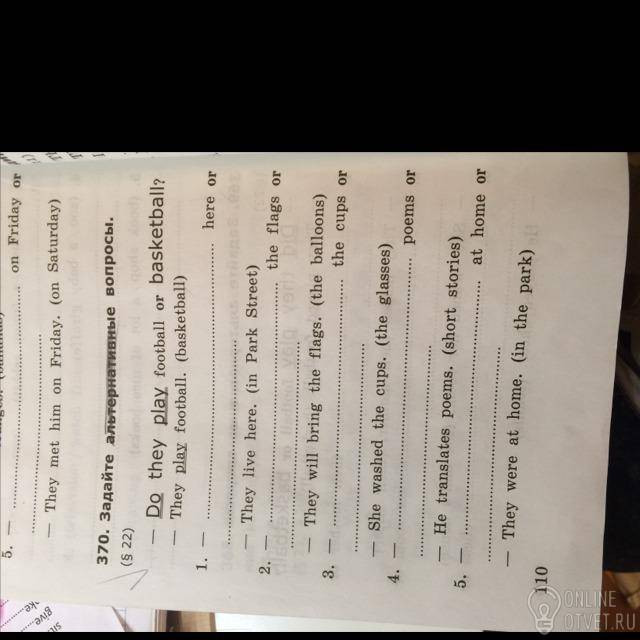 Do they live here or in Park Street?Will they bring the flags or the balloons?Did she wash the cups or the glasses?Does he translate poems or short stories?Were they at home or in the park?