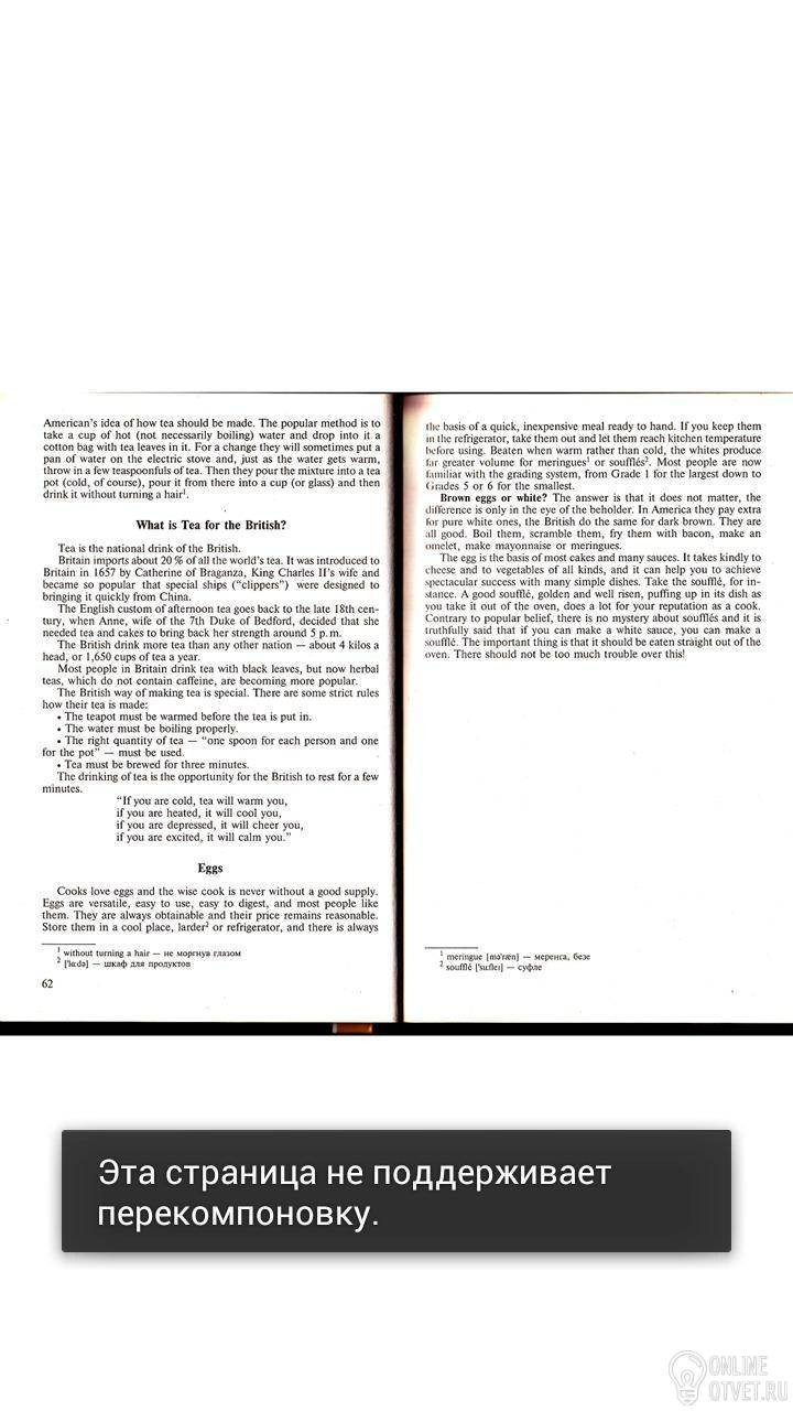 Чай является национальным напитком британцев.Великобритания импортируют около 20% всего чая в мире.Он был введён в Англии 1657года Екатериной Брагансой,жена короля Карла || стал настолько популярным ,что специальные корабли ("Клипперс") были разработаны ,чтобы превести его быстро в Китай.Английский обычай послеобеденного чая восходит к концу 18века,когда Энн -жнна седьмого герцога Бедфорда решела,что ей нужен чай и пирожное ,чтобы вернуть свои силы. В 5 часов вечера Англичане пьют чай больше,чем любая другая нация.4кг головы,или 1650 чашек чая в год.Большинство людей в Великобритание пьют чай с чёрными листьями,но теперь травяные чаи ,которые не содержат кофеина становятся популярными.Британский способ приготовления является особенным.Есть некоторые строгие правила,как сделан чай:чайник должен быть нагрет.Продолжение на фотографие.