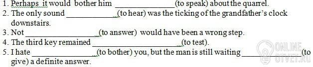Perhaps it would bother him speaking about the quarrel. Возможно, ему было бы скучно говорить о ссоре. The only sound to be heard was the ticking of the grandfather's clock downstairs. Единственным услышанным звуком, было тиканье дедовских часов снизу. The third key remained to test. Третий ключ остается для тестирования.Didn’t answer would have been a wrong step. Не отвечать, было бы неправильным шагом.I hate to bother you, but the mat is still waiting to be giving a definite answer. Я не хочу вас беспокоить, но человек все еще ждет, когда ему дадут однозначный ответ.