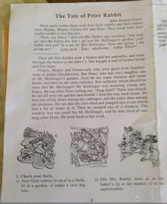 Флопси, Морси, Сотон-хвостик, которые были послушными маленькими крольчатами, пошли собирать чернику. Но Питер, который был очень непослушным, побежал в сад мистера Мак-Грегора. Для начала он поел немного салата и бобов, затем- немного редиса. Но неожиданно, кого бы вы думали он мог встретить, конечно, мистера Мак-Грегора! Мистер Мак-Грегор поливал молодую капусту. Он погнался за Питером с криком; "Стой, ворюга"! Питер испугался; он метался по всему саду и не мог найти путь домой. Он потерял один свой туфель среди капусты, другой - среди картофеля. Он забежал в сарай с инструментами и запрыгнул в бочку с водой. Затем, он выпрыгнул в окно. Окно было слишком маленьким для мистера Мак-Грегора, и он устал гоняясь за Питером. Он вернулся к своей работе.