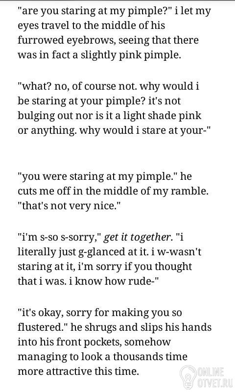 "Что ты уставился на мой прыщ?" Мои глаза поползли вверх,к середине его сдвинутых бровей,где действительно располагался чуть розовый прыщик.