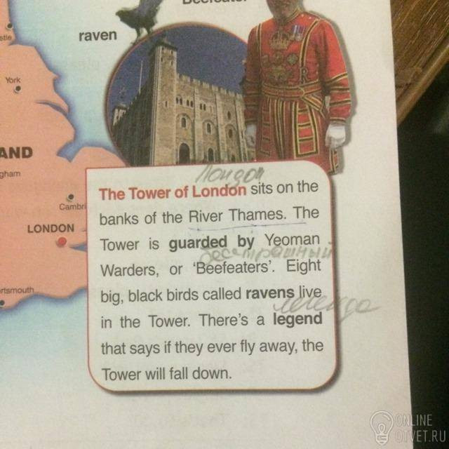 Лондонский Тауэр находится на берегу реки Темзы. Башня охраняется Бифитерами. Восемь больших, чёрных птиц называются воронами и живут в башне. Там есть легенда, которая гласит, что если они когда-то нибудь улетят, башня упадёт.