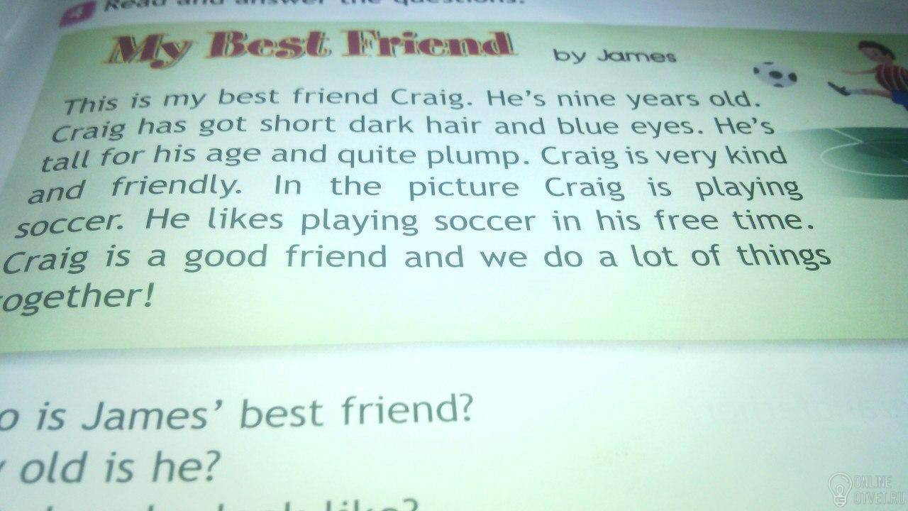 Это мой лучший друг Крейг. Ему 9 лет. У него короткие темные волосы и голубые глаза. Он высокий для своего возраста и вполне пухлый. Крейг очень добрый и приветливый. На картинке Крейг играет в футбол. Он любит играть в футбол в свободное время. Крейг отличный друг, и мы делаем вместе очень много вещей!