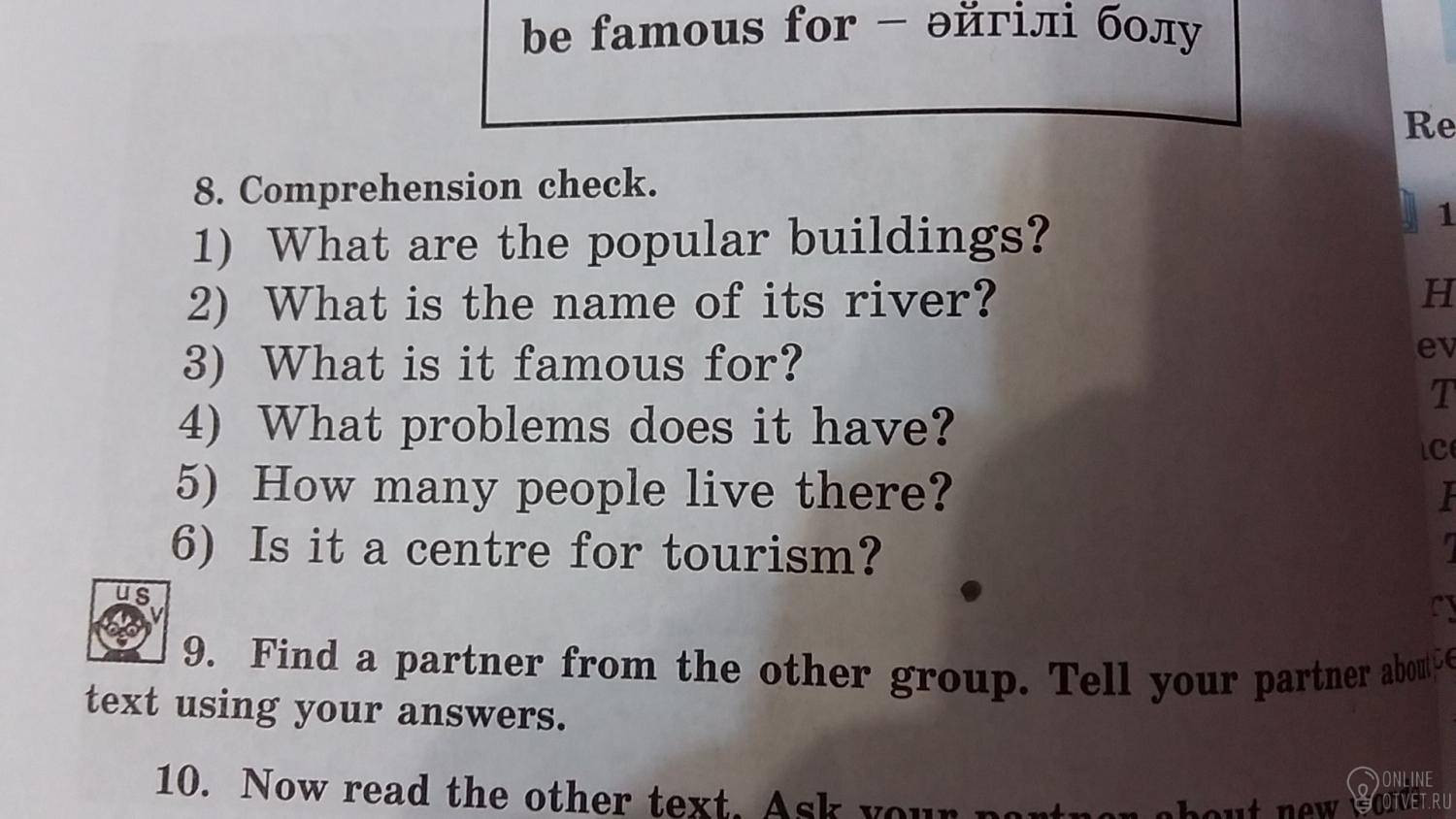 8. Постижение проверка 1) Каковы популярные здания? 2) Что такое название своей реки? 3) Что это славится? 4) Какие проблемы у него есть? 5) Сколько там живут люди? 6) Является ли это центр туризма?