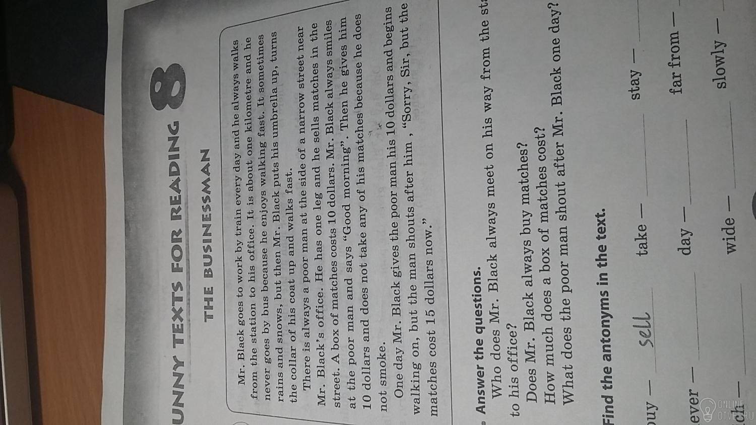 Мр. Блэк ездит на работу на поезде каждый день и он всегда идет от станции в свой офис. Это где-то около 1 км и он никогда не едет на автобусе. т.к. ему нравится быстро ходить пешком. Иногда идет дождь или снег,но мистер Блэк открывает свой зонт,поднимает воротник и идет бытро.