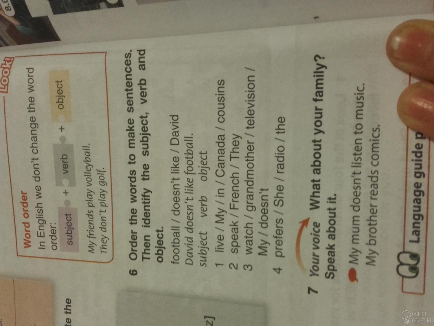 1) My cousins live in Canada 2) They speak French 3) My grandmother doesn't watch television 4) She prefers radio. Подлежащее›сказуемое›дополнение.