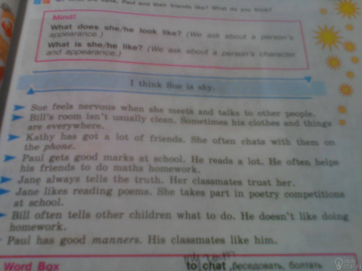 Сью чувствует себя нервничать, когда она встречает и общается с другими людьми комнате Билла обычно не elean. Sometimew его одежда и вещи "Кэти приобрела много друзей. Она часто болтает с ними на Павла получает хорошие оценки в школе. Он много читает. Он часто belps своих друзей, чтобы сделать математику домашнее задание. Пер всегда говорит правду. Ее одноклассники ей доверять. ане любит читать стихи. Она принимает участие в конкурсах поэзии школы. Л.Л. часто говорит другим детям, что делать. Он не любит делать уль имеет хорошие манеры. его elassmates, как он