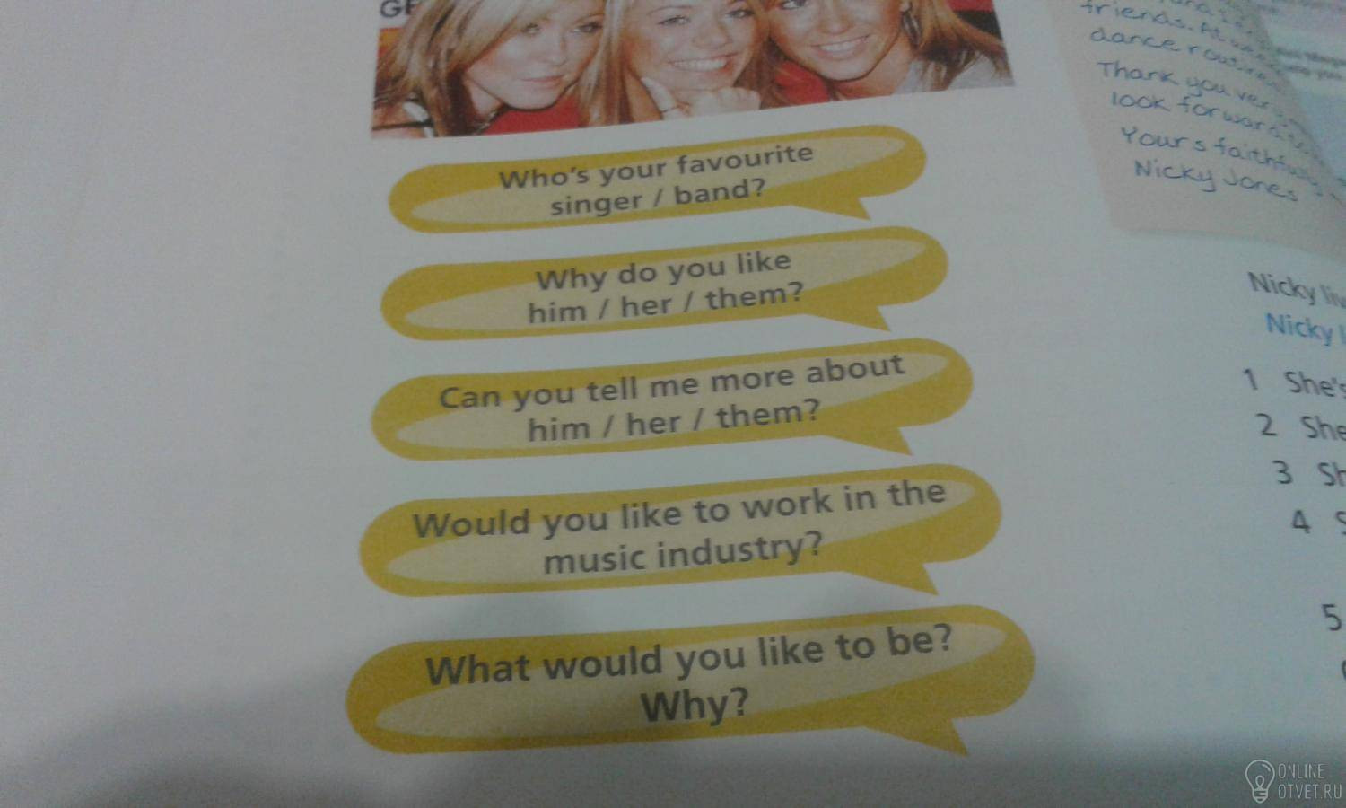 Кто твоя любимый певец\группа? Почемы вы любите его\ее\их? Можете ли вы рассказать мне больше о нем\ей\их? Хотели бы вы работать в музыкальной индустрии? Что бы вы хотели быть?Почему?