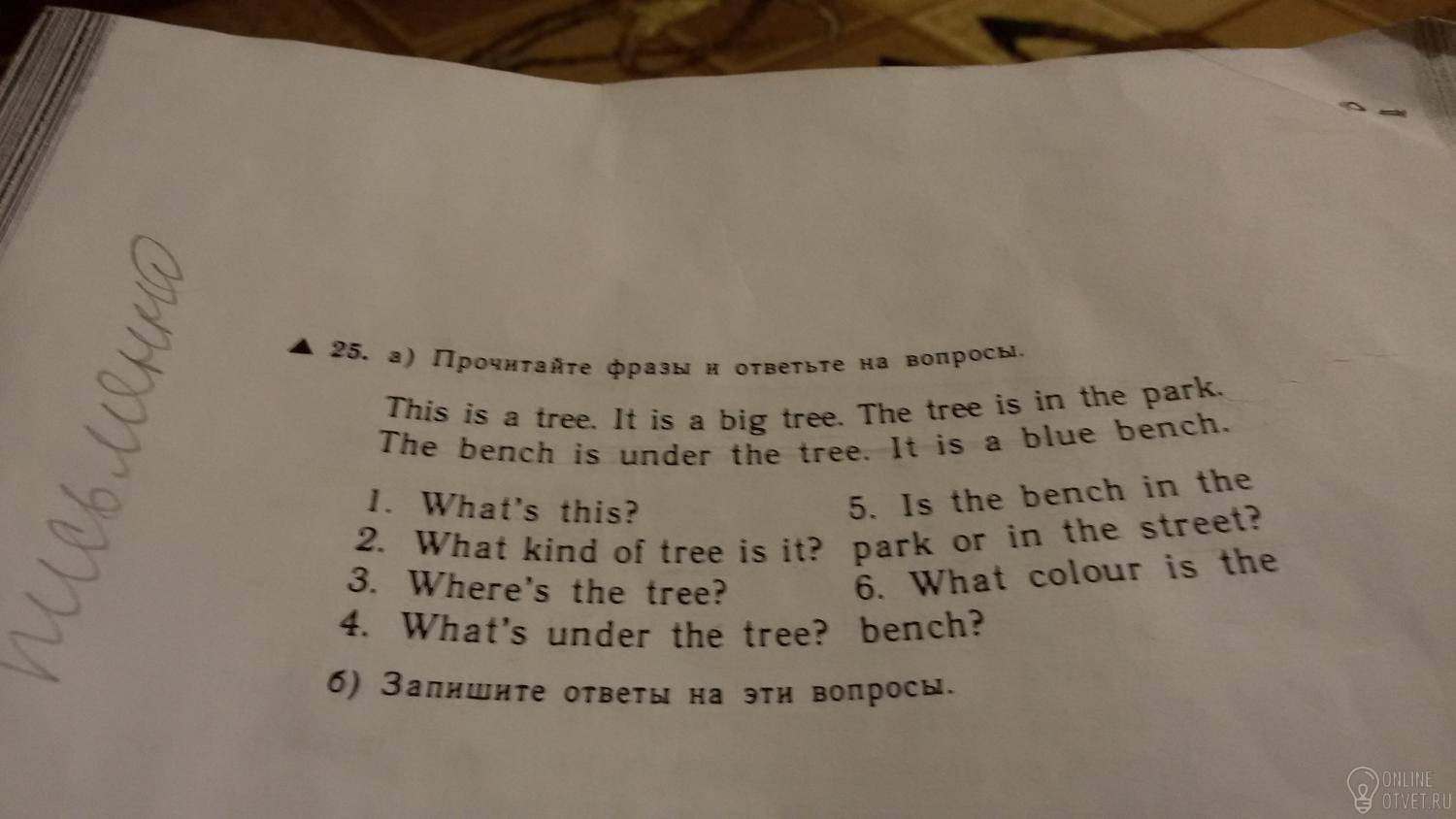 4. The bench is under the tree (Скамейка находится под деревом).