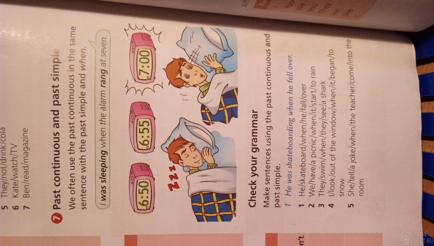 2.We were having picnic when it started to rain. 3.They were swimming when they saw a shark. 4.I was looking out of the window when it began to snow. 5.She was telling a joke when teacher came into the room.