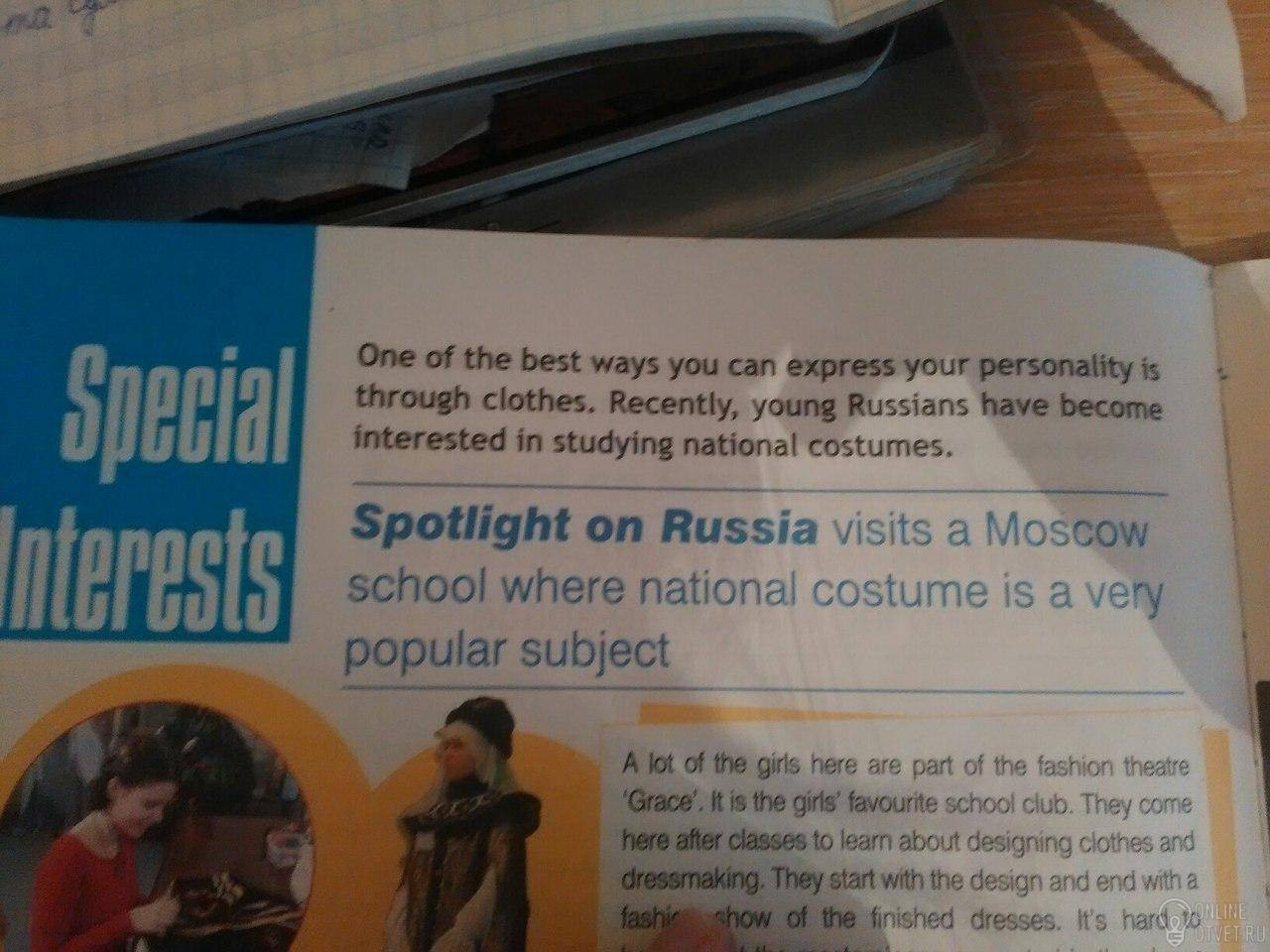 Один проект о русских национальных костюмах ,законченный учениками в школе, был назван"традиции этнических мотивов в русских национальных костюмах. Он включал несколько женских костюмов и так же демонстрировал традиционные русские музыкальные инструменты такие как балалайка.