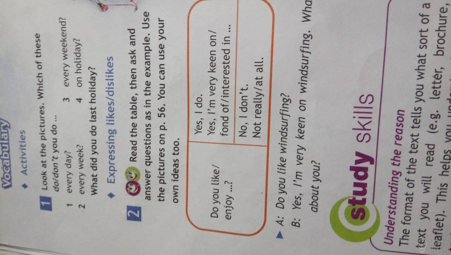 Прочитай таблицу, затем задай вопросы и ответь на них, как показано в примере. Используй картинки на странице 56. Также ты можешь использовать свои собственные идеи.
