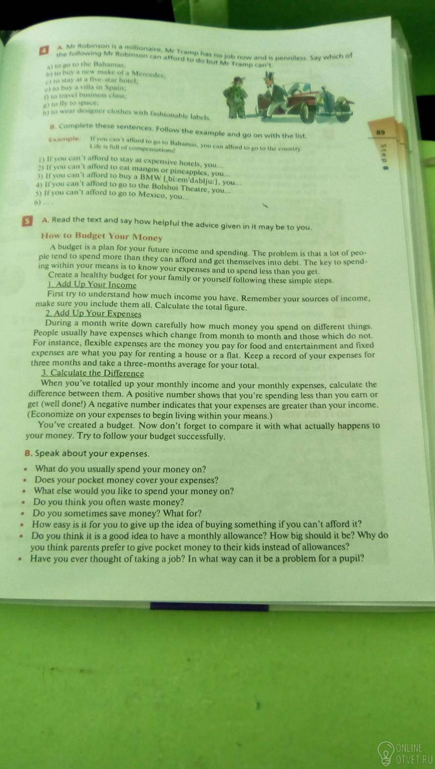 Текст и сказать, насколько полезным совет, данный в нем может быть вам Как бюджета ваши деньги бюджет план для вашего будущего дохода и расходов. Проблема в том, тайский много ПЭО, как правило, тратят больше, чем они могут себе позволить, и получить себе в долги Ключ провести ING в пределах Ваших средств будет знать ваши расходы и тратить меньше, чем вы гель Создать здоровый бюджет для вашей семьи или самостоятельно, следуя этим простым шагам Сначала попытайтесь понять, сколько дохода у вас есть. Помните, ваши источники дохода, убедитесь, что вы включили все. Вычислить общую цифру. 2 Добавьте вверх ваши расходы в течение месяца пишут вниз тщательно, сколько денег вы тратите на разные вещи. Люди, как правило, расходы, которые изменяются от месяца к месяцу и те, которые не, например, гибкие расходы деньги, которые вы платите за питание и развлечения и фиксированные расходы, что вы платите за аренду дом или квартиру. Записывайте ваши расходы в течение трех месяцев и занять в среднем три месяца для вашего общего. 3 Вычислить разницу, когда вы составили свой ежемесячный доход и ваши ежемесячные расходы, рассчитать разницу между ними. Положительное число показывает, что вы тратите меньше, чем вы EAM или получить (молодец!) Отрицательное число указывает на то, что ваши расходы больше, чем ваш доход (экономили на ваши расходы, чтобы начать жить в пределах Ваших средств.) Вы создали бюджет. Теперь не забудьте сравнить его с тем, что на самом деле происходит с вашими деньгами. Попробуйте следовать ваш бюджет успешно. B. Говорите о ваших расходах. Что вы обычно тратите свои деньги? Охватывает ли ваш карманные деньги ваши расходы? Что еще вы хотели бы тратить деньги на? Как вы думаете, вы часто тратить деньги? Вы иногда сэкономить деньги? Зачем? Насколько легко для вас, чтобы отказаться от идеи покупать что-то, если вы не можете себе это позволить? Как вы думаете, что это хорошая идея, чтобы иметь ежемесячное пособие? Насколько велика она должна быть? Почему вы думаете, родители предпочитают давать карманные деньги своим детям вместо пособий? Вы когда-нибудь думали о принятии на работу? Каким образом это может быть проблемой для ученика?