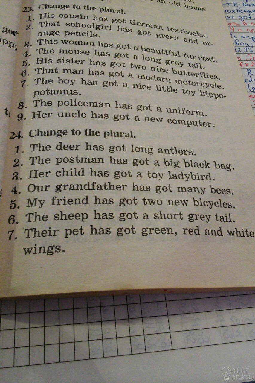 23. 1 his cousins have got german textbooks 2 those schoolgirls have got green and orange pencils 3 these women have got a beautiful fur coats 4 the mouses have got a long grey tails 5 his sisters have got two nice butterflies 6 those men have got a modern motorcycles 7 the boys have got a nice little toys hippopotamus 8 the policemen have got a uniforms 9 her uncles have got a new computers 24. 1 the deers have got long antlers 2 the postmen have got a big black bags 3 her children have got a toy ladybirds 4 our grandfathers have got many bees 5 my friends have got two new bicycles 6 the sheeps have got a short grey tails 7 their pets have got green, red and white wings.