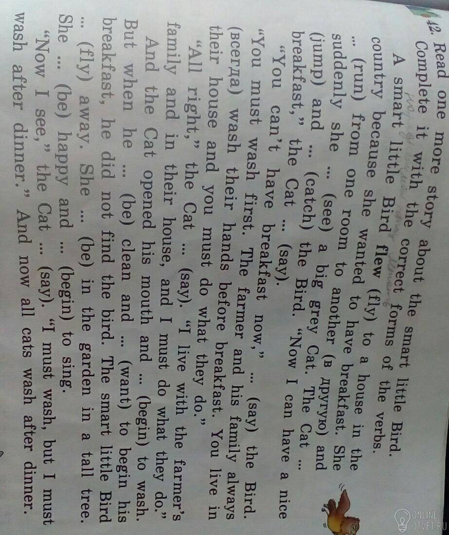 Доделайте его с помощью умной маленькой птицы. История умная маленькая птичка правильные формы глаголов untry потому что (муха) к дому (бегу) от она хотела ddenly она одна комната для того чтобы иметь завтрак. Она говорит: «Я не могу позавтракать (скажем) с B»), и (см.) A к другому (B и eakfast «(поймать) большой серый кот. Вы должны сначала вымыться. Фермер и его семья alw ria) моют руки перед завтраком. Вы живете в доме, и вы должны делать то, что они делают. «Хорошо, говорит Кот». «Я живу с фермой и в их доме, и я должен делать то, что они открыли своему коту и начали Когда он (будет) чист и хочет), чтобы начать kfast, он не нашел птицу. Умная маленькая муха) прочь. Она (была) в саду в высокой t (быть) счастливым и (начать) петь. Как я вижу, «Кот». «Мне нужно вымыться, но я после обеда. И теперь все кошки умываются после ужина