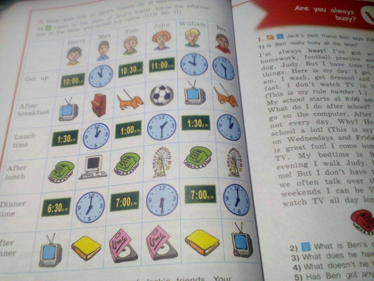 Что делает Джек на выходных? Послушайте историю Джека и проследить за его действиями. Тебе надо прослушать вообщем и просто отметить что во сколько он делает))