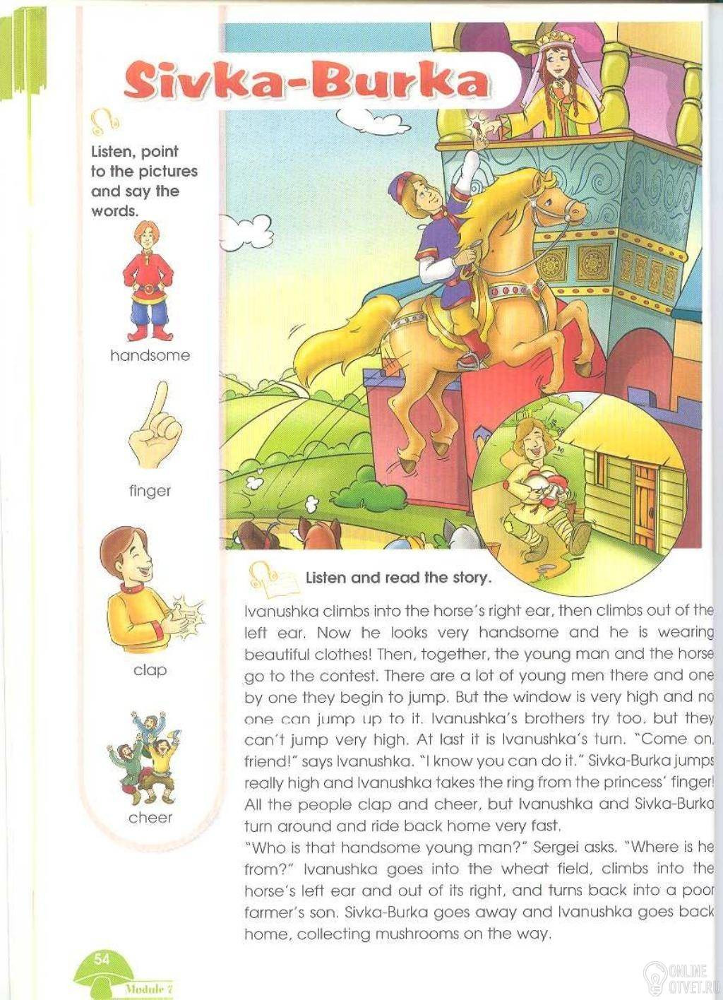 Влез Иванушка коню в правое ухо, а в левое вылез — и стал таким молодцом, что ни вздумать, ни взгадать, ни в сказке сказать, ни пером описать! Сел на Сивку-бурку и поскакал прямо к городу. Нагнал он по дороге своих братьев, проскакал мимо них, пылью дорожной осыпал. Прискакал Иванушка на площадь — прямо к царскому дворцу. Смотрит — народу видимо-невидимо, а в высоком терему, у окна, сидит царевна Елена Прекрасная. На руке у нее перстень сверкает — цены ему нет! А собою она красавица из красавиц. Глядят все на Елену Прекрасную, а никто не решается до нее доскочить: никому нет охоты шею себе ломать. Ударил тут Иванушка Сивку-бурку по крутым бокам... Фыркнул конь, заржал, прыгнул — только на три бревна до царевны не допрыгнул.