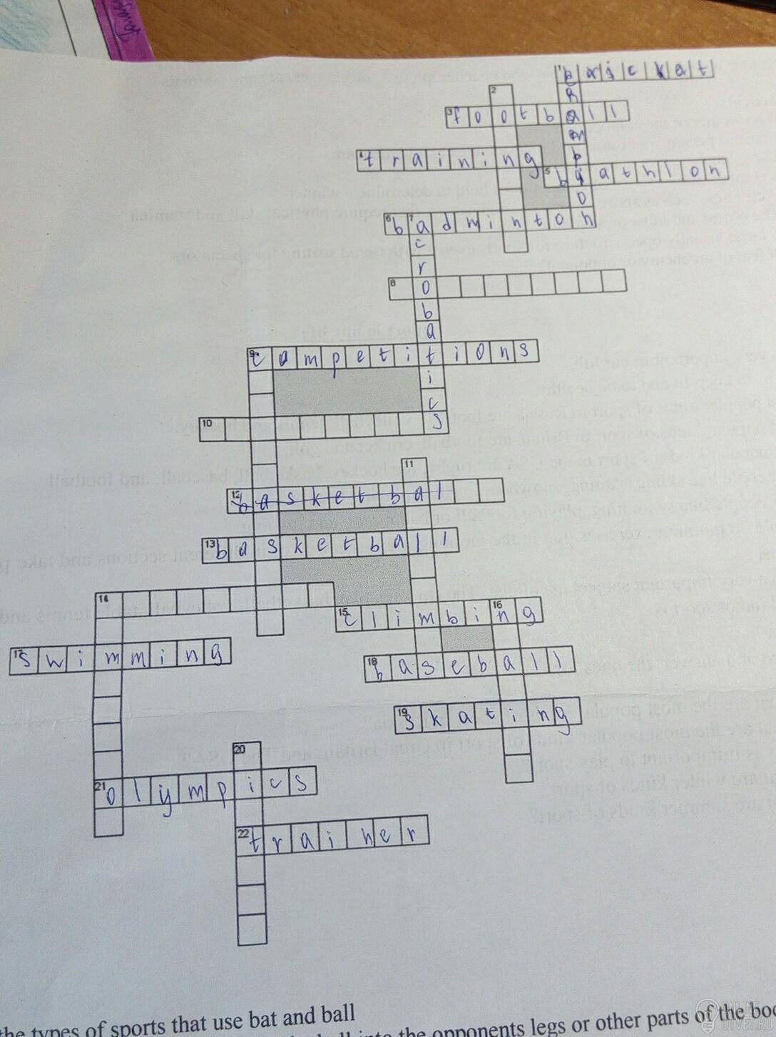 По горизонтали 1. One of the types of sports that use bat and ball 3. Team sport in which the goal is to get the ball into the opponents legs or other parts of the body ( except the hands ) 4. A program of physical fitness that involves such exercise 5. Winter sport that combines ski race with shooting a rifle 19 . Sport which involves the movement of an athlete or a pair of athletes skating on ice 21. Major international multi - sport event 22. One who trains , especially one who coaches athletes , racehorses , or show animals По вертикали 1. The winner of the competition 2. Sports a person who trains or directs athletes or athletic teams . 6. A sport in which players are on opposite sides of the site and divided by a net slung shuttlecock over the net impacts . 15. Mountain climbing , especially in the alps 17. Sports discipline is to bridge swimming various distances 18. A team sports game with the ball and bat